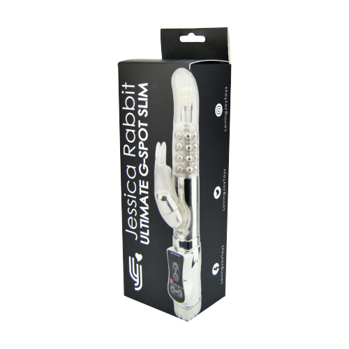 The Jessica Rabbit Ultimate G-Spot Slim from Loving Joy is the perfect tool for G Spot stimulation. If you haven’t found your G Spot yet, this is a great vibe to go exploring with! It features a slim shaft with a curved tip its specially designed to find the destination with ease. Three rows of beads in the multi speed rotating shaft gives great vaginal stimulation, make your way through the six speeds to see which you like best. As well as G Spot and vaginal stimulation it has bunny ears to simultaneously stimulate your clitoris – WOW! The bunny ears also have 6 speeds so you decide how intense you want it. A great toy that’s easy to use and sure to satisfy. Customise your orgasms today. Waterproof too for those that like to use their toys in the bath or shower. Insertable length of 12cm (4.75 inches) Circumference 9cm (3.5 inches) Required 4 x AAA batteries (not included)