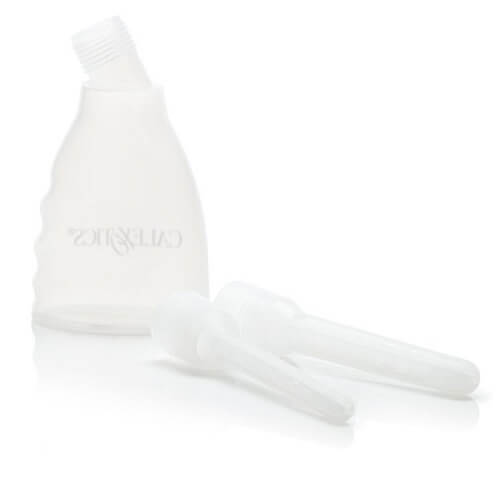 Simply fill with warm water and use as directed – there are two sizes of nozzle and they have side jets for thorough cleansing.